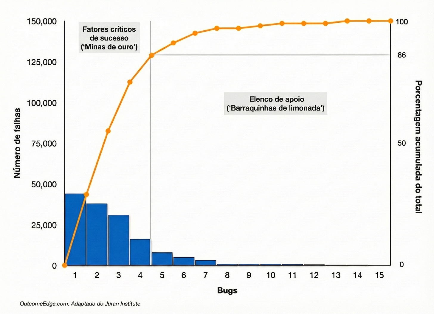 O gráfico mostra claramente que apenas quatro bugs são responsáveis por 86% das falhas: